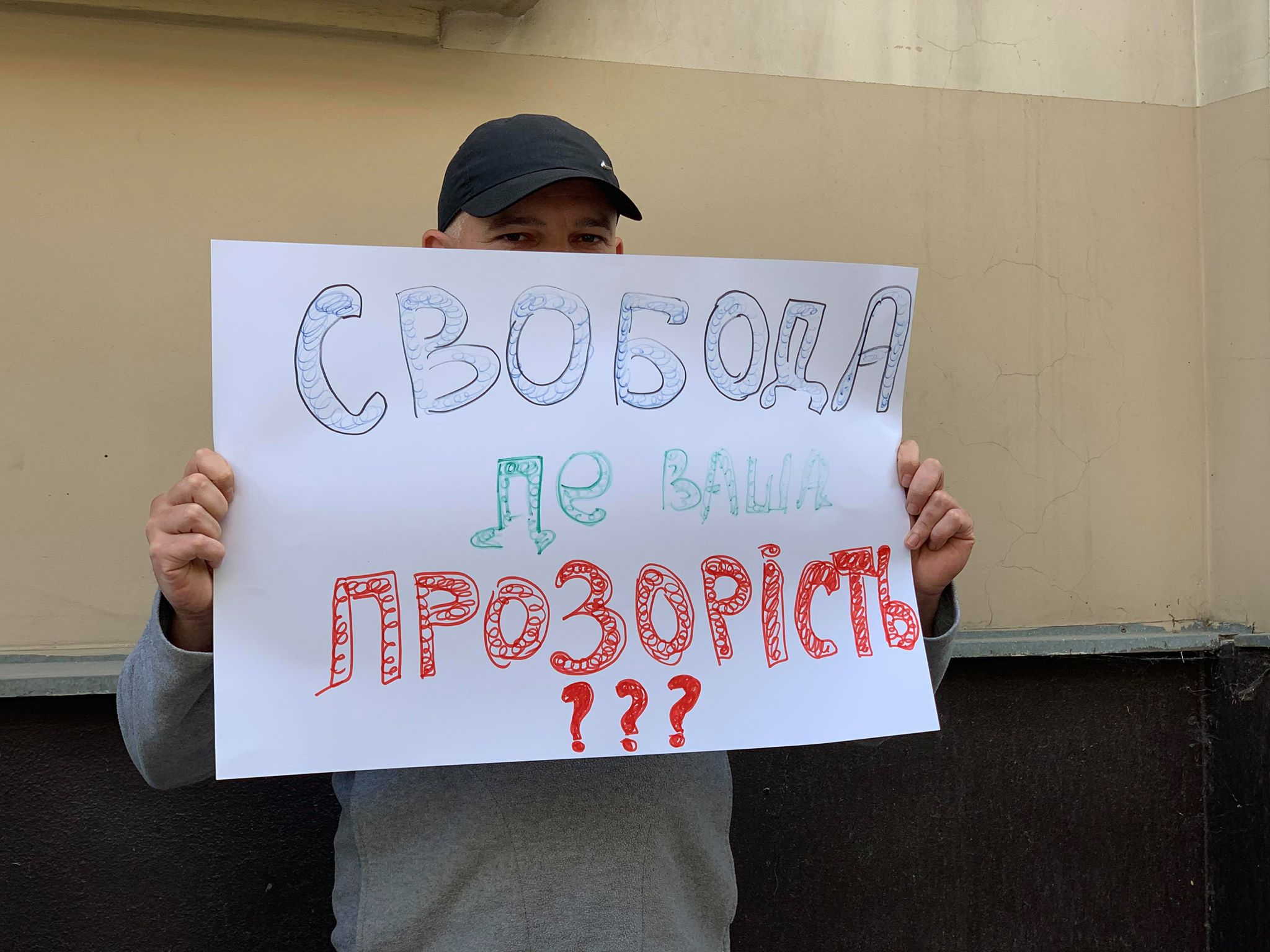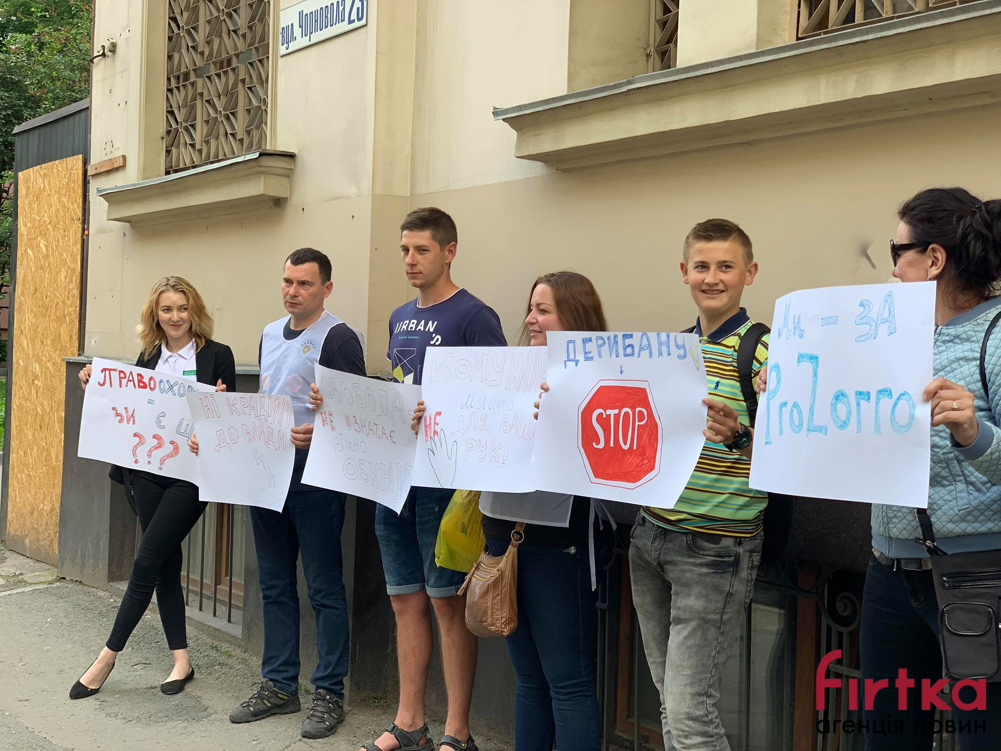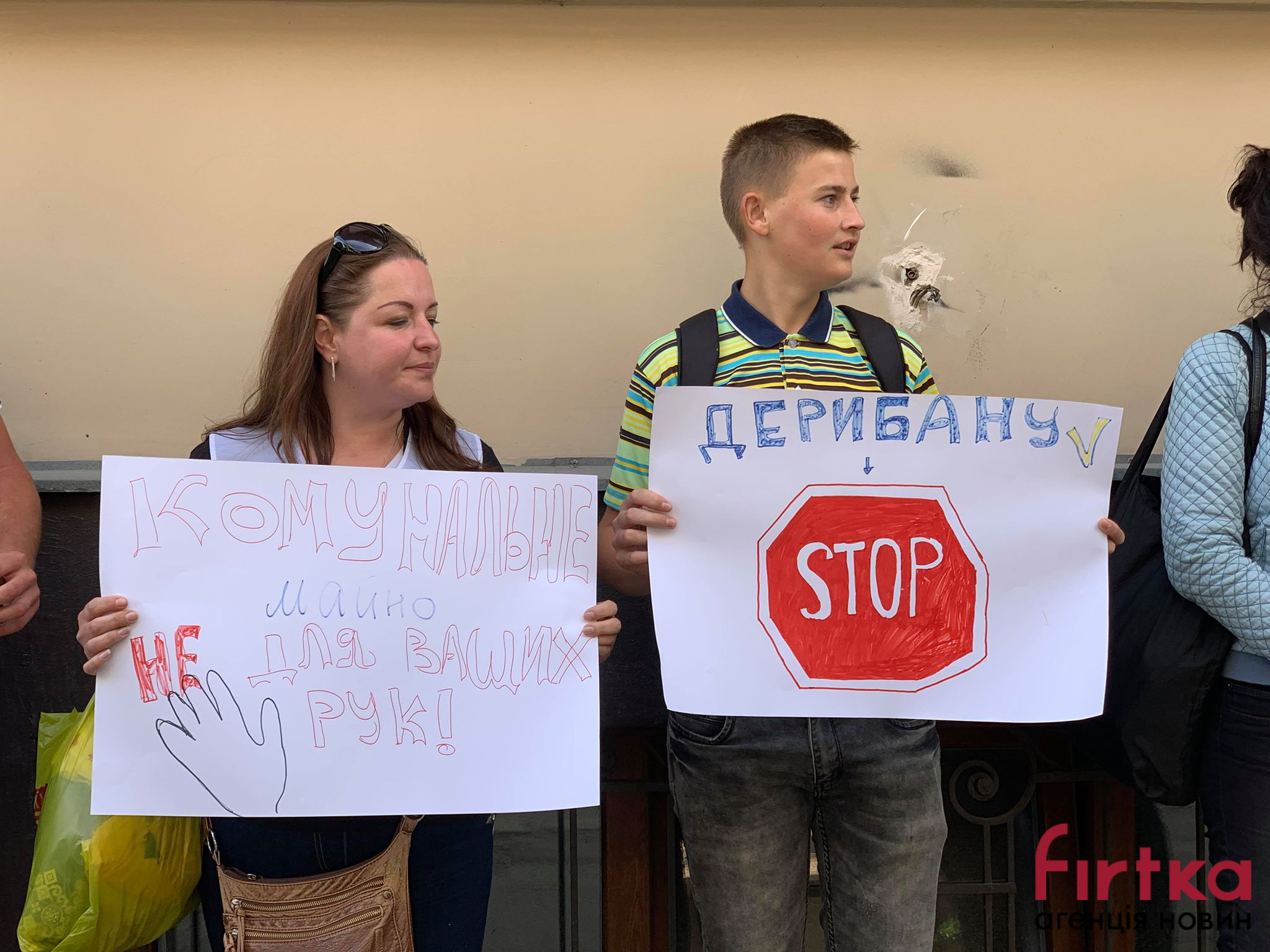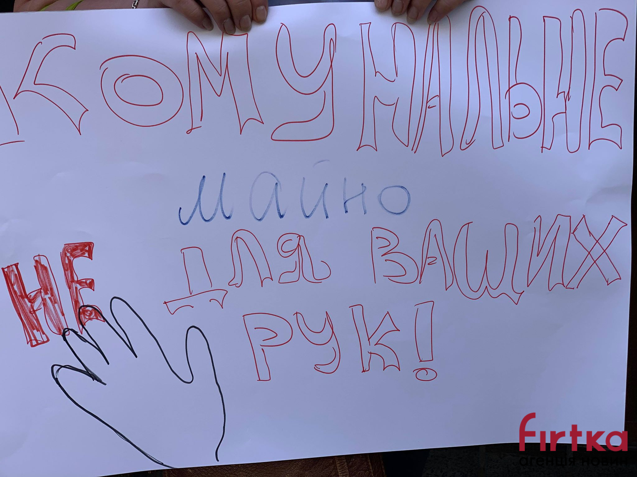Кілька активістів тримають в руках плакати із написами - "Комунальне майно не для ваших рук", "Стоп дерибану", "Свобода - де прозорість" та ін.