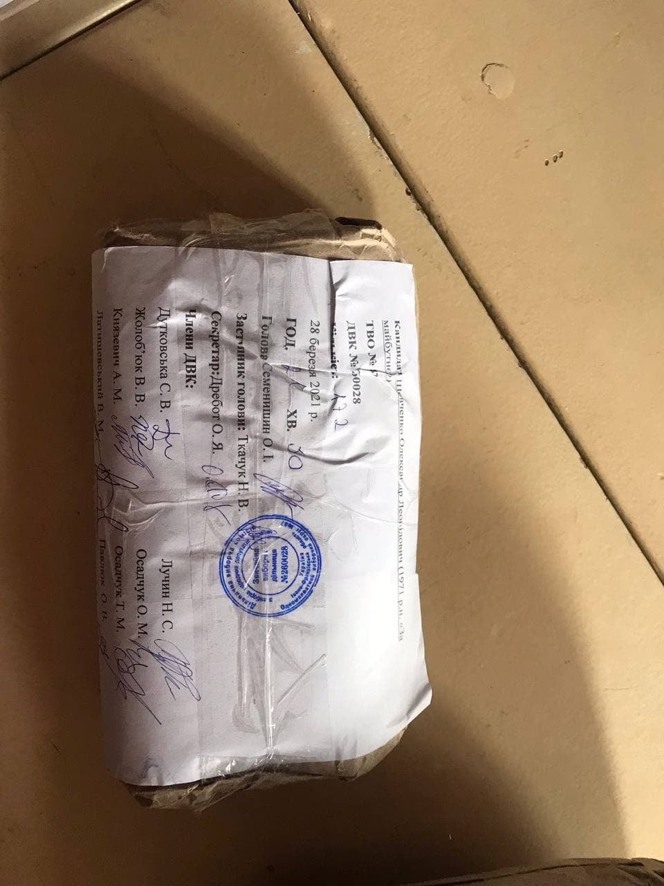 "Це вже навіть не смішно! Вп'яте пропадають бюлетені. Цього разу нарахували 79 бюлетенів за Шевченка. Куди поділися ще 93? Здається, це просто нахабне знущання! Ми сфотографували пошкоджене пакування за кандидата Олександра Шевченка. Члени ДВК стверджують, що згорток з підписами обгортали навколо пакета", - йдеться у повідомленні.