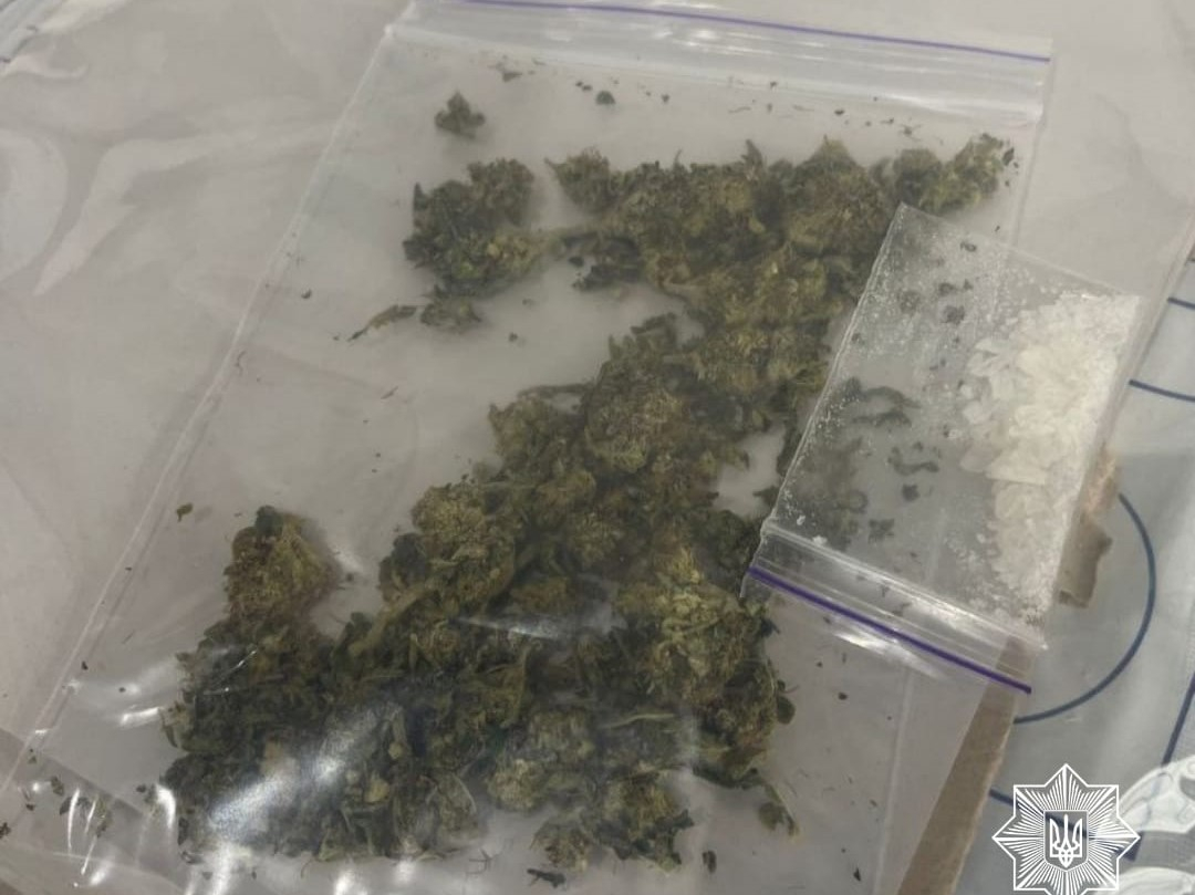 Під час поверхневої перевірки 21-річного чоловіка патрульні виявили у нього пакети з невідомою речовиною білого кольору та трав’янистою речовиною, а також пристрій для викурювання наркотиків.