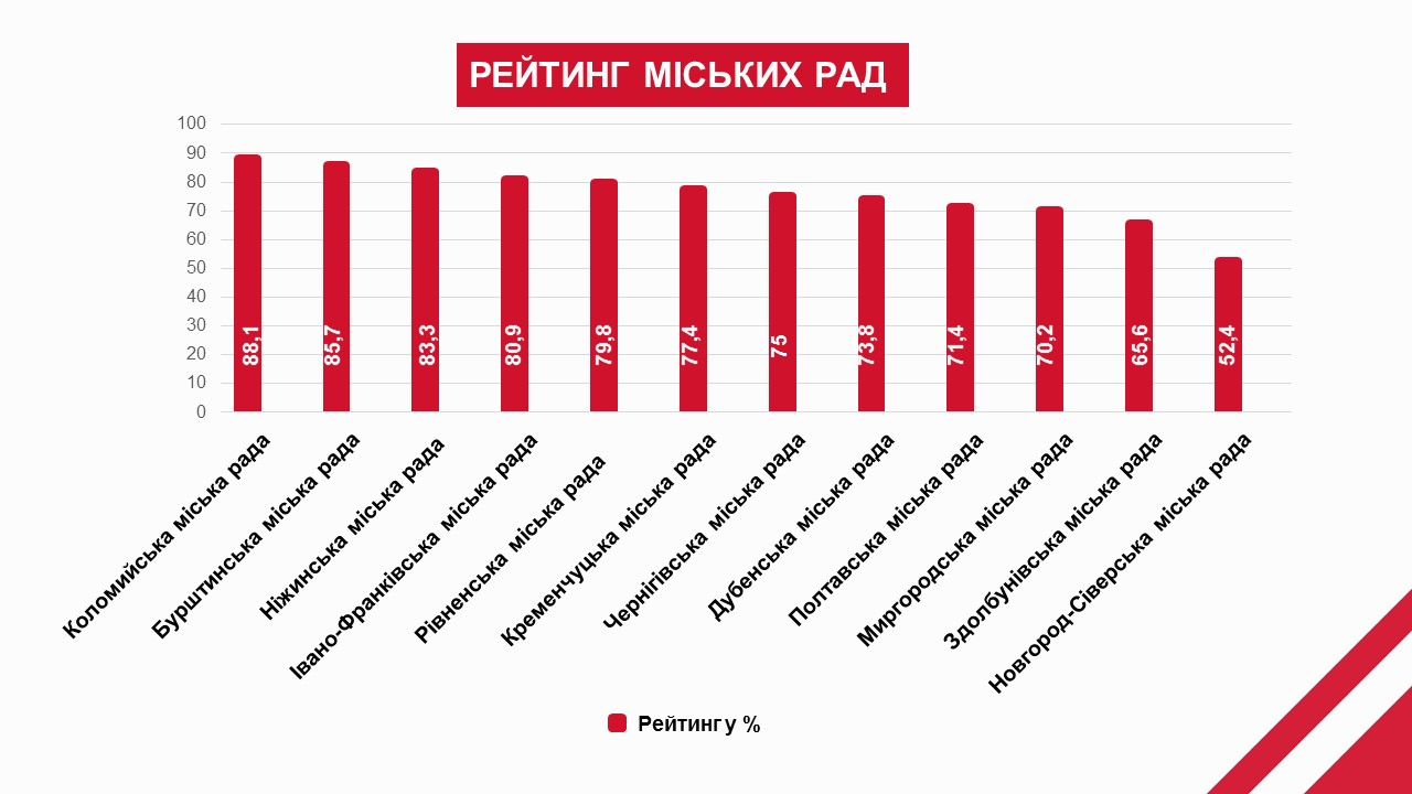 Підсумковий рейтинг прозорості та підзвітності серед міста з рад очолила Коломийська міськрада, яка за пів року піднялася на дев'ять сходинок. Відразу за нею, на другій позиції, опинилася Бурштинська міська рада. Івано-Франківська міська рада змістилася на четверте місце.