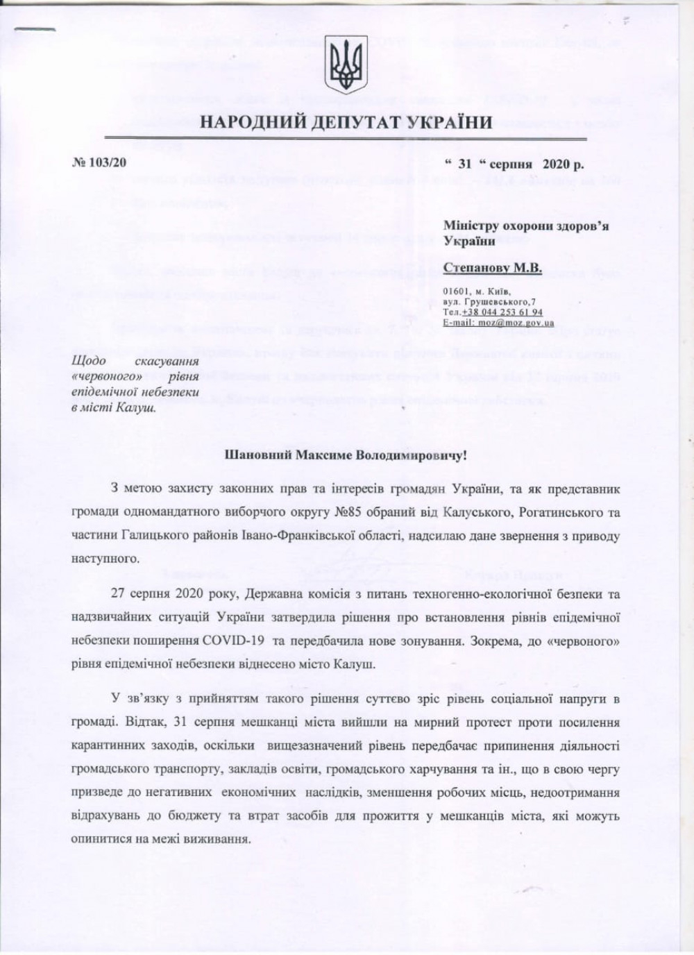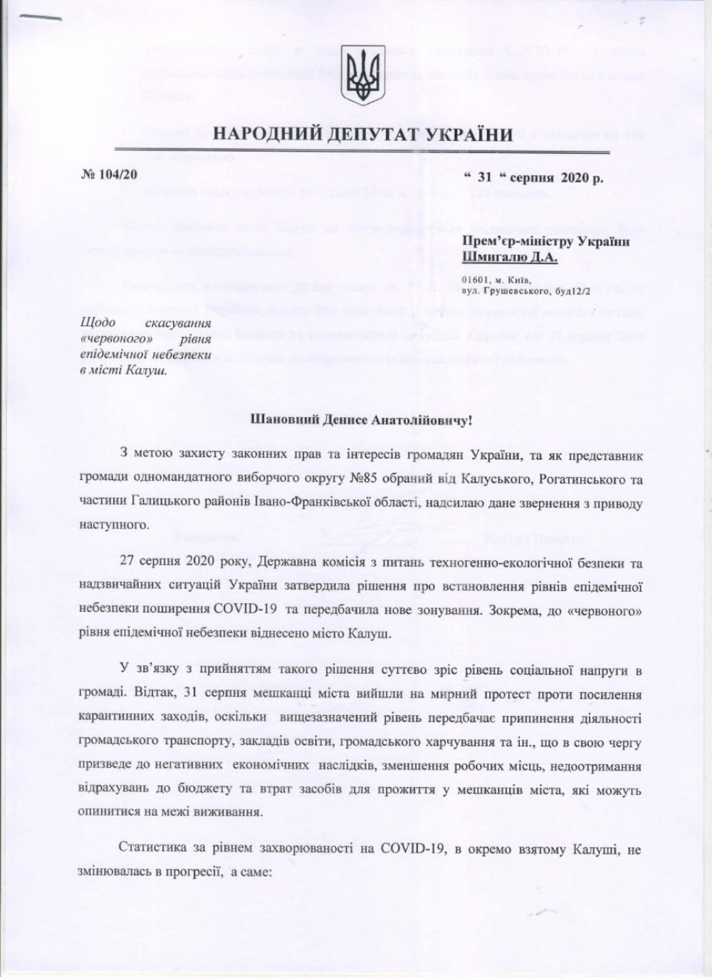 У депутатському зверненні зазначено показники захворюваності у Калуші, які, відповідно до постанови Кабміну,не є підставою для введення "червоного" рівня епідемічної небезпеки: