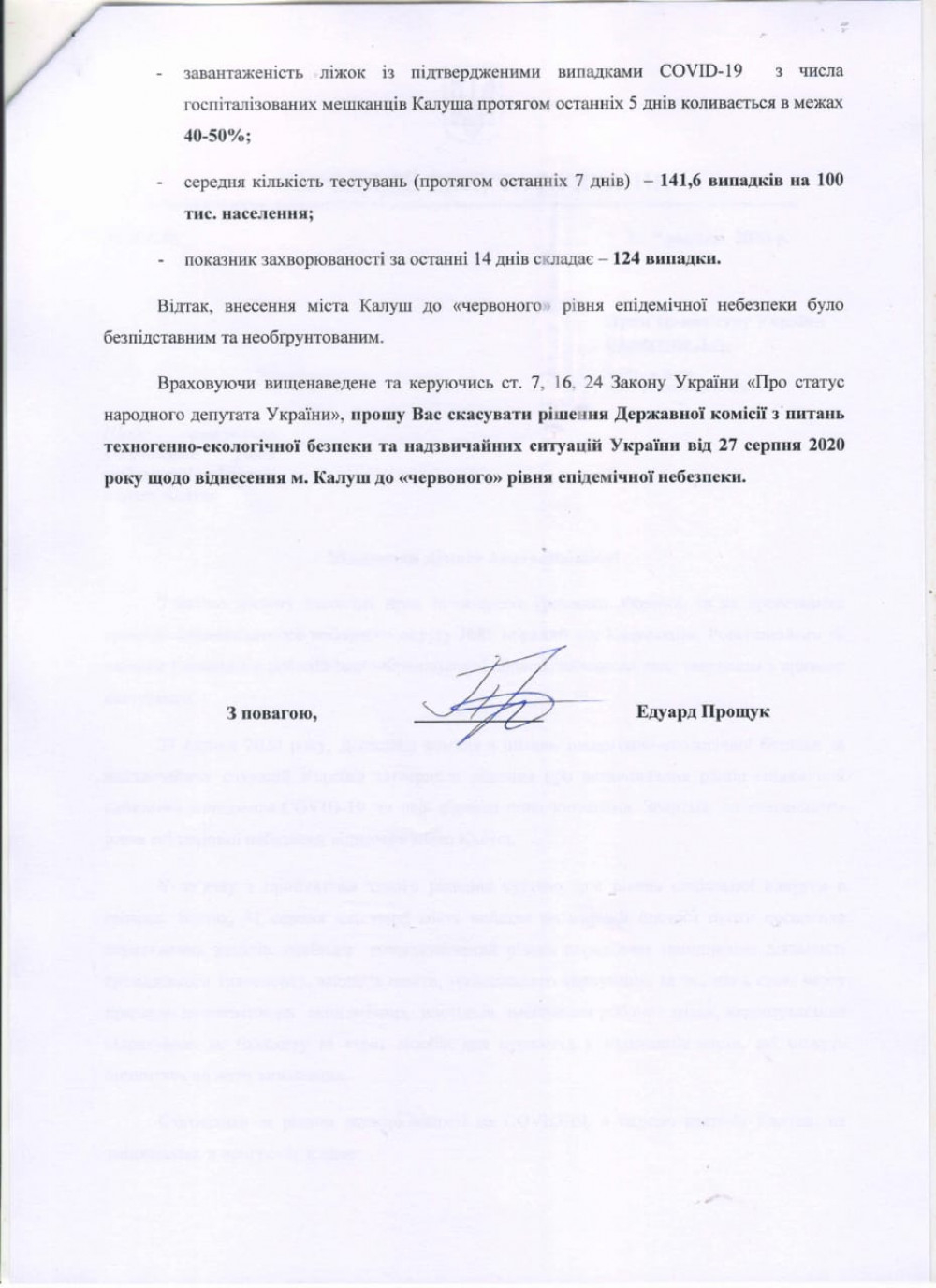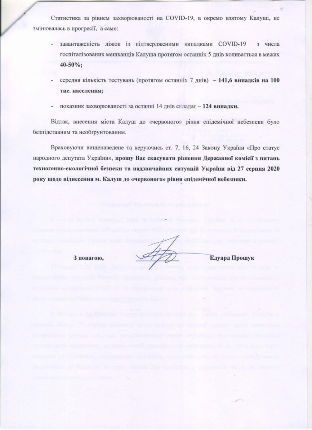 Народний депутат від 85 виборчого округу Едуард Прощук звернувся до прем'єр-міністра України Дениса Шмигаля та міністра охорони здоров'я Максима Степанова з вимогою переглянути та скасувати рішення про віднесення міста Калуш до "червоного" рівня епідемічної небезпеки.