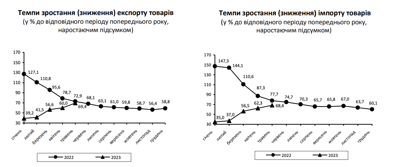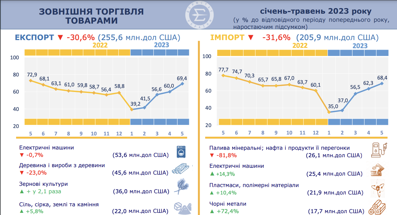 Так, у порівнянні з січнем—травнем 2022 року обсяги експорту зменшились на 30,6%, імпорту — на 31,6%.