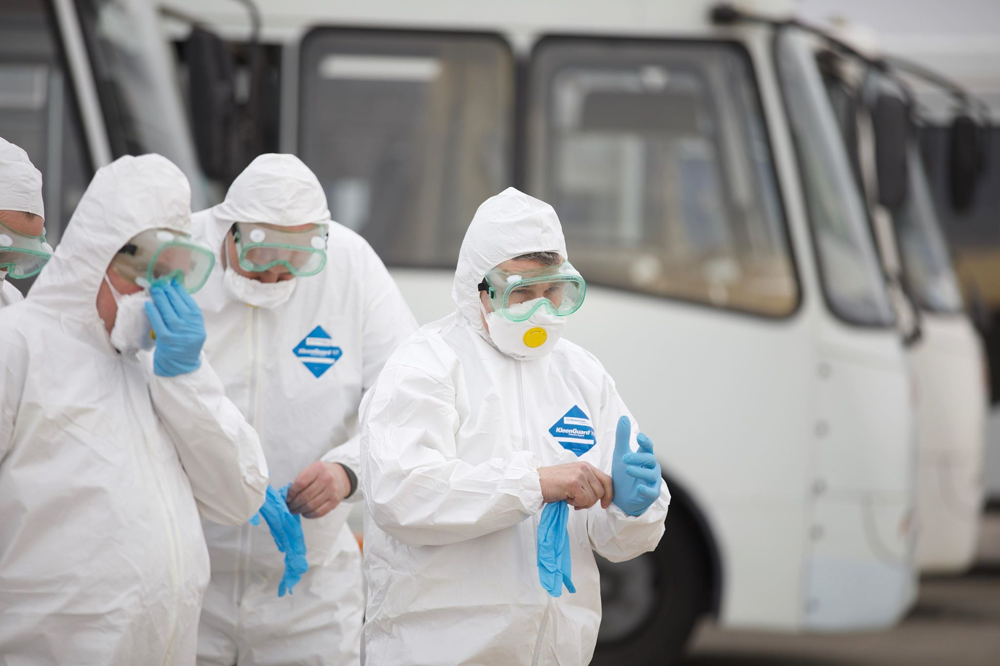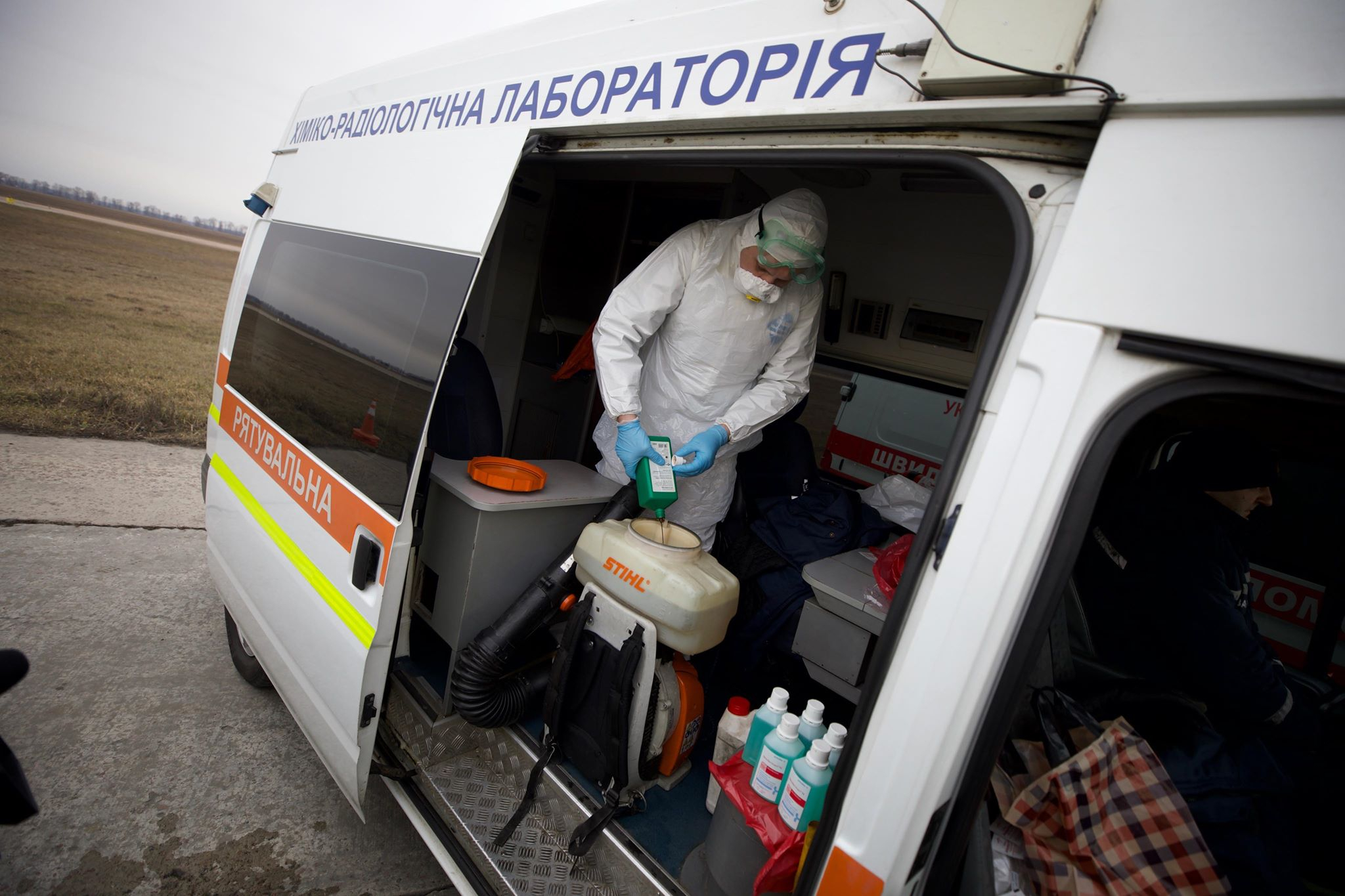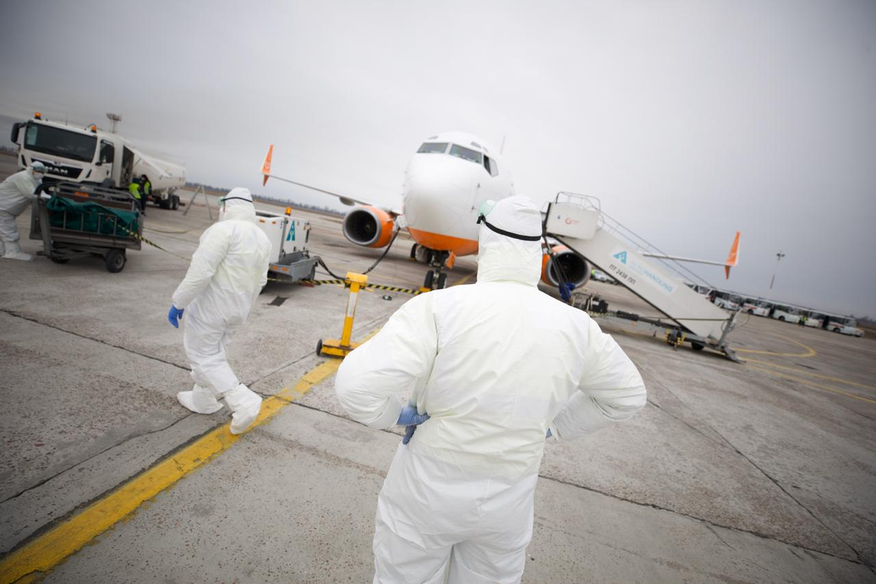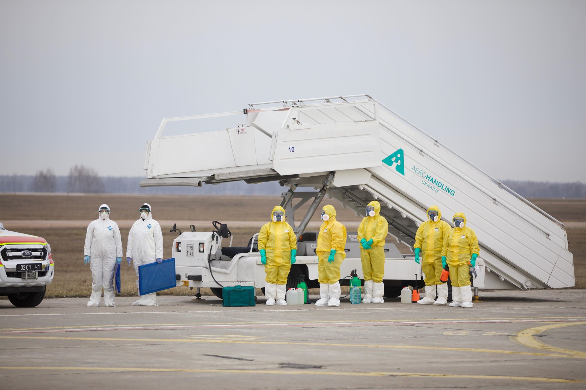 На злітно-посадковій смузі до його прильоту підготувалися люди в костюмах біологічного захисту.