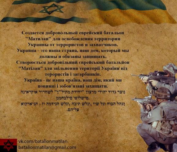 «Відбувається створення добровольчого єврейського батальйону для звільнення території України від терористів і загарбників. Адміністратор цієї групи був військовослужбовцем Цахалу, і просить всіх євреїв, які проживають на території країни, де вони народилися, виросли і живуть, приєднатися до батальйону «Матилан». Україна - це наша країна, наш дім, який ми повинні і зобов'язані захищати», - пишуть в мережі «ВКонтакте» адміністратори однойменної групи.