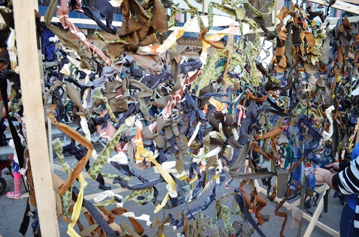 Для того, щоб сплести маскувальну сітку, потрібно багато клаптиків різної тканини та не один метр рибальської сітки. Головна особливість виробу – відсутність ліній та хаотичний відтінок.