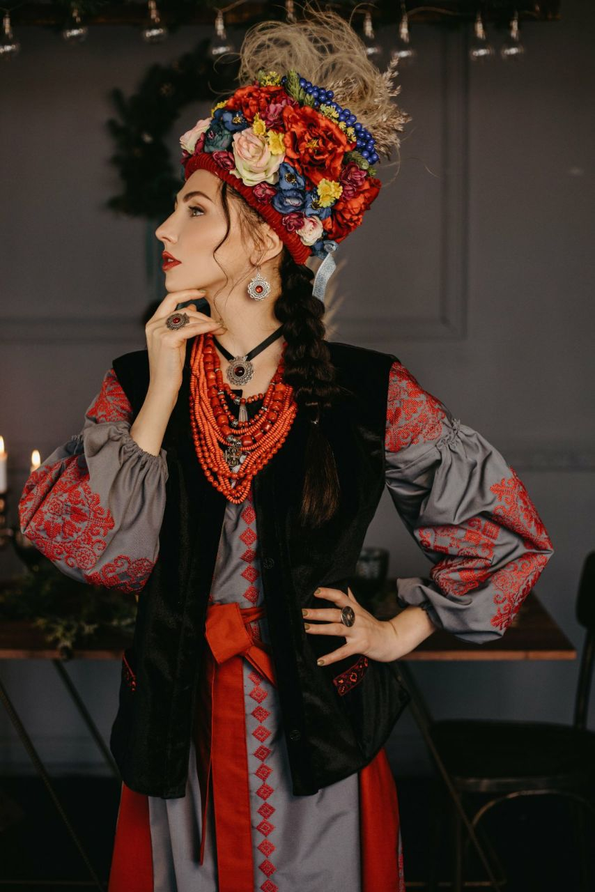 Головний убір, що на голові франківчанки – це стилізація традиційного буковинського вінка з ковилою “коди”, “вінок з павунами”.
