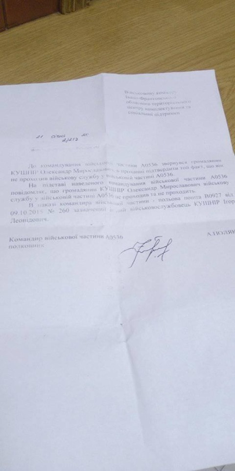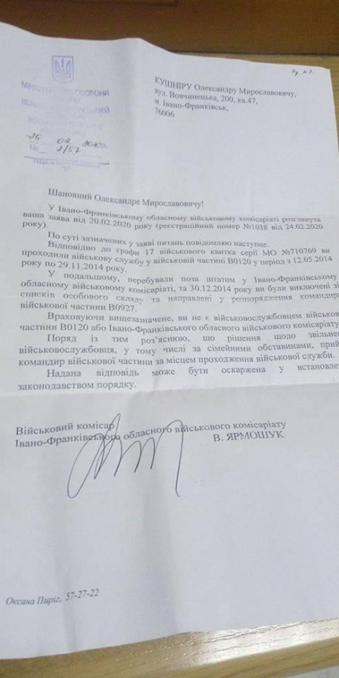 У четвер 5 березня 2020 року в соціальній мережі з’явився допис іванофранківця Олександра Кушніра, який вже 5-й рік не може звільнитися із військових лав та відповідно офіційно влаштуватися на роботу.