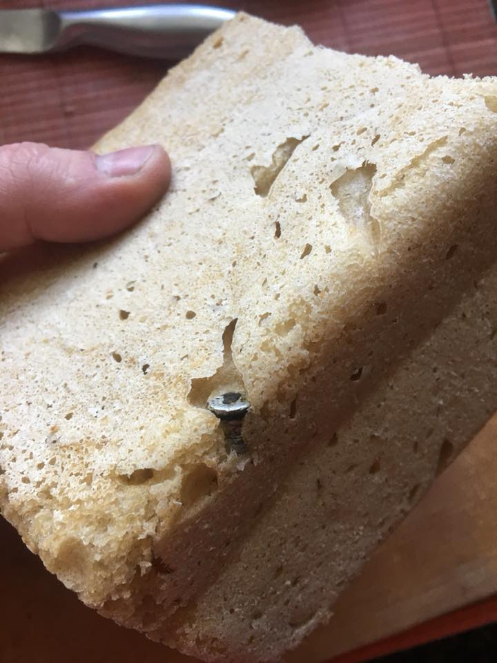 "Всі ми любимо залізничний хліб. Коли не прийдеш - завжди свіжий і запашний. Був їхнім постійним клієнтом поки в суботу не купив таке. Купив 2 буханки Орільського, в неділю в другій буханці було знайдено не то залишок болта, не то якась заклепка, типу того", - йдеться у повідомленні.