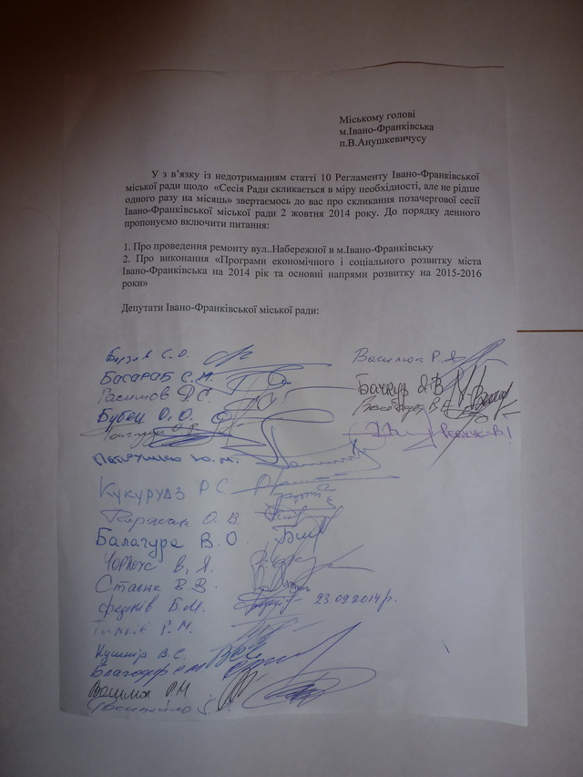 25-го вересня у канцелярію міського виконавчого комітету надійшов лист від 21 депутата Івано-Франківської міської ради. У листі депутати просять скликати сесію на 2 жовтня.
