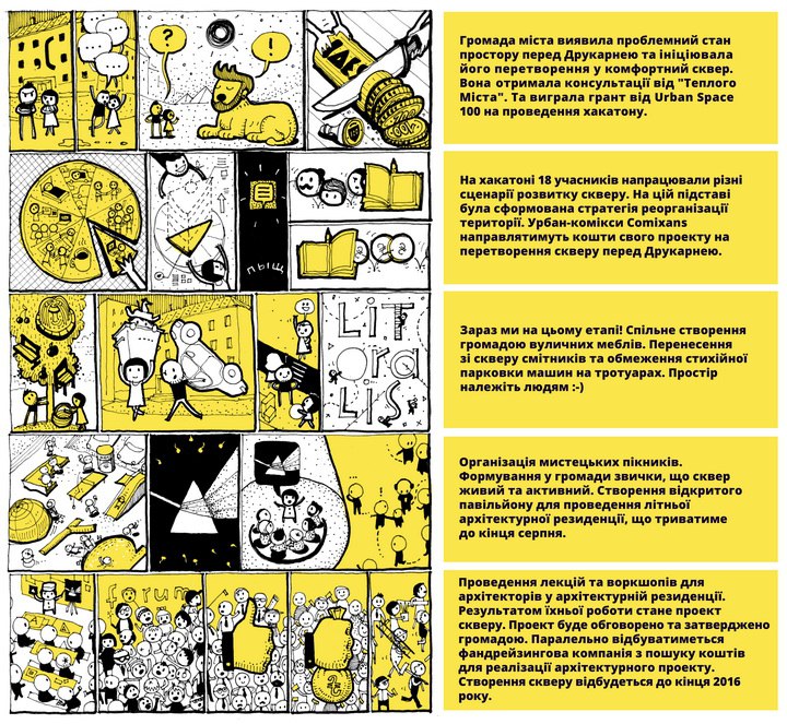 Ідею перетворення скверу перед друкарнею франківські урбаністи зобразили в одному коміксі. Автор – Ярослав Яковлев, ілюстратор проекту “Франек, добрий ранек!”