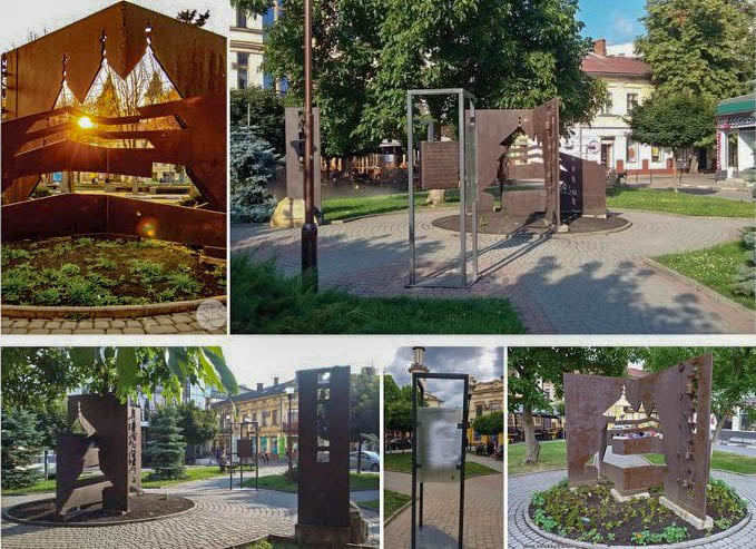 Ідея пам’ятного знаку Першій українській церкві в Івано-Франківську полягає в створенні візуального «повітряного» образу силуету церкви, утвореного взаємним перетином чотирьох вертикальних металевих листів з наскрізними прорізами заданої конфігурації. Колір та фактура скульптурної композиції – природній колір кородованої сталі, рівномірність якого забезпечена спеціальною обробкою кислотою. В контексті встановлення пам’ятного знаку і було розроблено та виконано проєкт комплексної реконструкції скверу, композиційним центром якого є власне пам’ятний знак, розташований на перетині пішохідних доріжок.