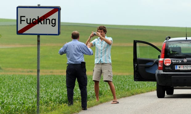 Туристи фотографують дорожній знак села Fucking. Відвідувачі навіть неодноразово крали вказівники. Фотографія: Младен Антонов/AFP/Getty Images