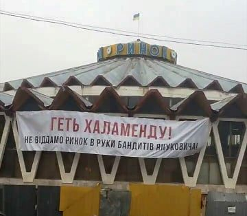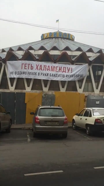 Сьогодні, 21 листопада, у Франківську на Центральному ринку невідомі повісили плакат із надписом “Геть Халаменду: не віддамо ринок в руки бандитів Януковича”.