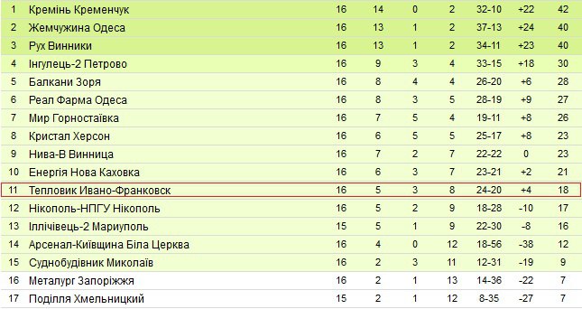 В турнірній таблиці іванофранківці із 18 очками посідають 11 сходинку.