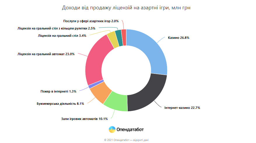 За даними Опендатабот, станом на листопад цього року найбільше доходів було отримано від продажу ліцензій на організацію азартних ігор у гральних залах казино (360 мільйонів гривень) та у мережі Інтернет (304 мільйонів гривень), а також від встановлення гральних автоматів – 309 мільйонів гривень.