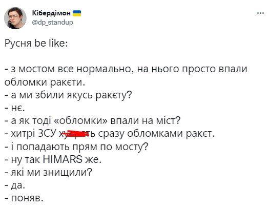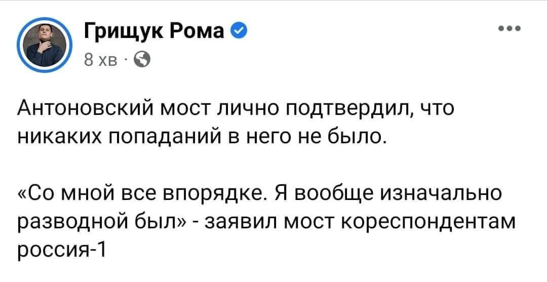 За його словами, можна назвати Антонівський міст «засобом російської ППО, який перехоплює українські ракети, але від реальності не втечеш».