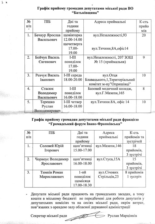 Графік прийому громадян депутатами Івано-Франківської міської ради та кількість проведених прийомів громадян і зустрічей кожним депутатом Івано-Франківської міської ради:
