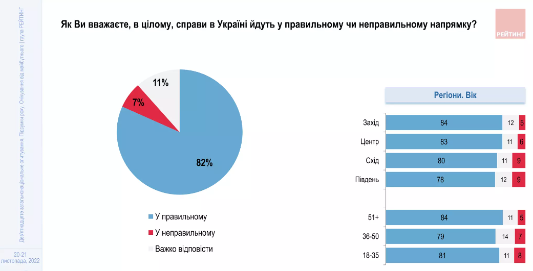 Загалом 82% опитаних українців вважають, що країна рухається у правильному напрямку. Оцінка напрямку розвитку справ як правильного домінує в усіх регіональних розподілах та вікових групах.