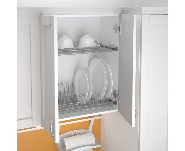 У більшості випадків, сушарку встановлюють у навісну шафу, розташовану відразу над мийкою. Деякі роблять таку конструкцію без нижнього днища. Тоді вода тече безпосередньо в раковину, і потреби використовувати піддон немає. Такий варіант розташування дуже зручний з наступних причин: