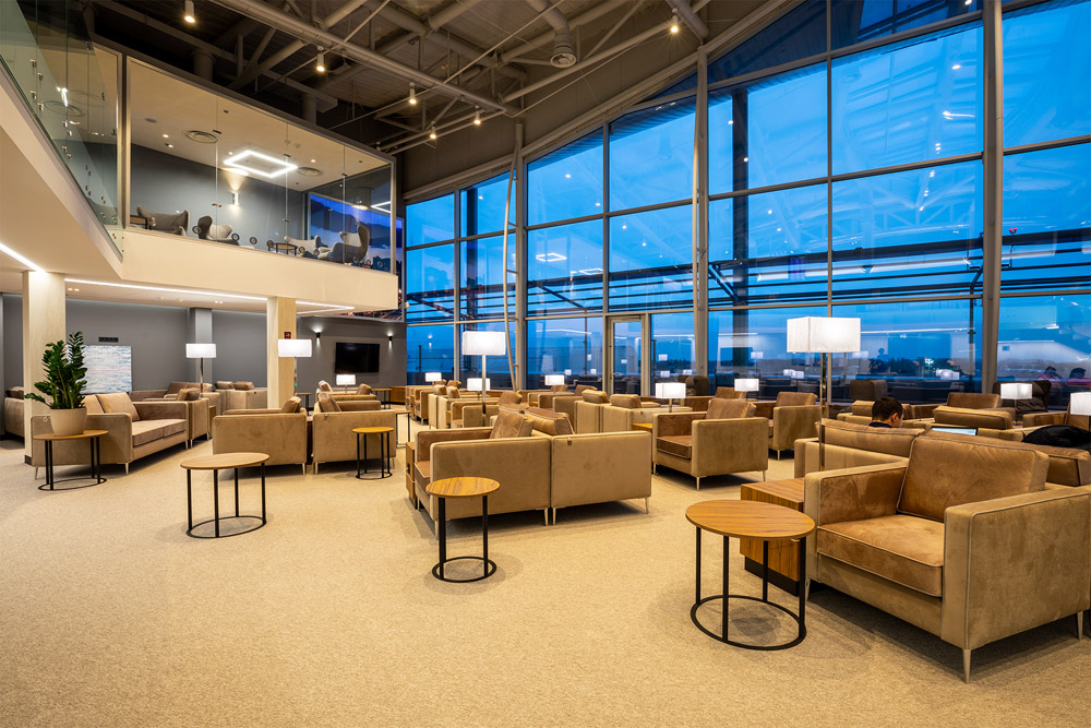 Новий дворівневий лаунж площею 776 м2 може похвалитися чудовим панорамним видом, з якого можна побачити перон та злітно-посадкову смугу. На першому рівні розташовується ресторан, кімната переговорів, душові зони, а також комфортабельні крісла для відпочинку. На другому рівні для відвідувачів передбачена ізольована кімната для куріння, оснащена системою примусової вентиляції, а також зручні канапи.