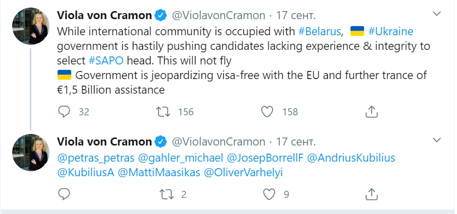 По-перше, всі західні партнери наголошували на не допустимості не прозорого призначення керівництва САП. Кілька тижнів тому одну з таких атак вдалось відбити - ВРУ не назбирала необхідної кількості голосів за створення комісії. Якщо хтось має сумніви щодо позиції наших партнерів, може зайти у Твіттер Віоли фон Крамон, депутатки Європарламенту. Там є й оцінка ситуації, і віртуальна дискусія з керівником моно більшості щодо подальшого майбутнього нашої держави.