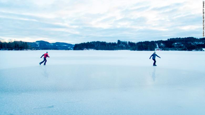 Двоє чоловіків катаються на кризі, яка вкрила озеро в Тронхеймі, Норвегія.