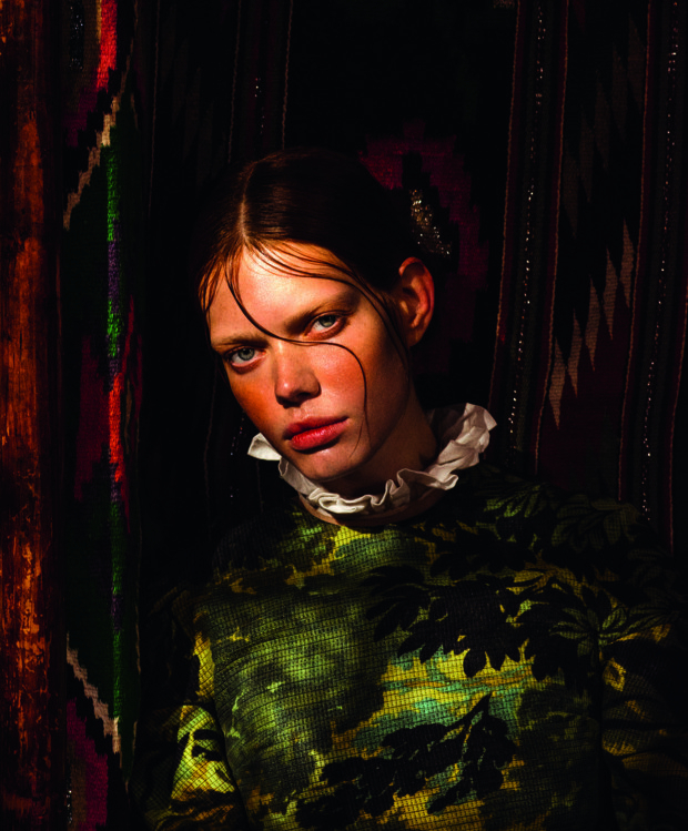 На першому плані – моделі в міксі автентичного і модного одягу. Дублянка Burberry, розшита блуза Alexander McQueen, шовкові сукні Dior в поєднанні з вишиванками, кожухами і плахтами мають вигляд демонстрації модного тренду на фольклорні слов’янські мотиви. Сучасне життя поруч з автентикою – дуже колоритне. Обидві сторони дивляться одна на одну з цікавістю.
