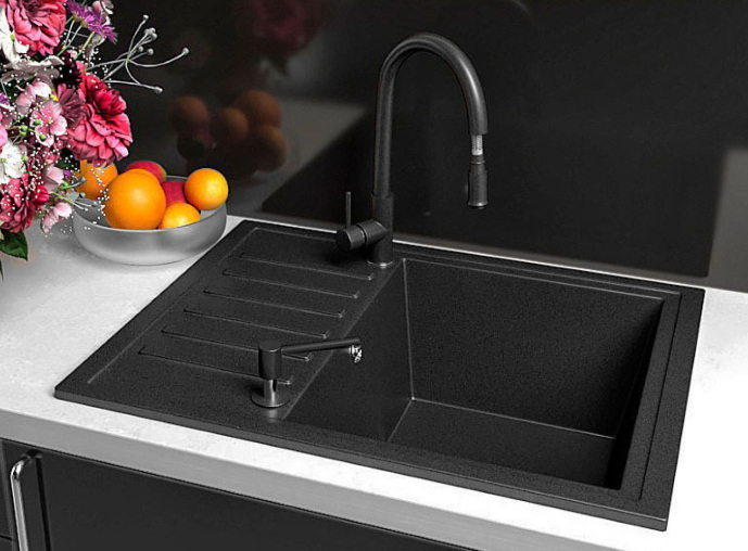 - Граніт або кварцовий композит. Такі мийки виглядають ефектно, не шумлять при потраплянні води, не бояться подряпин. Вони важчі, дорожчі, але й значно довговічніші.