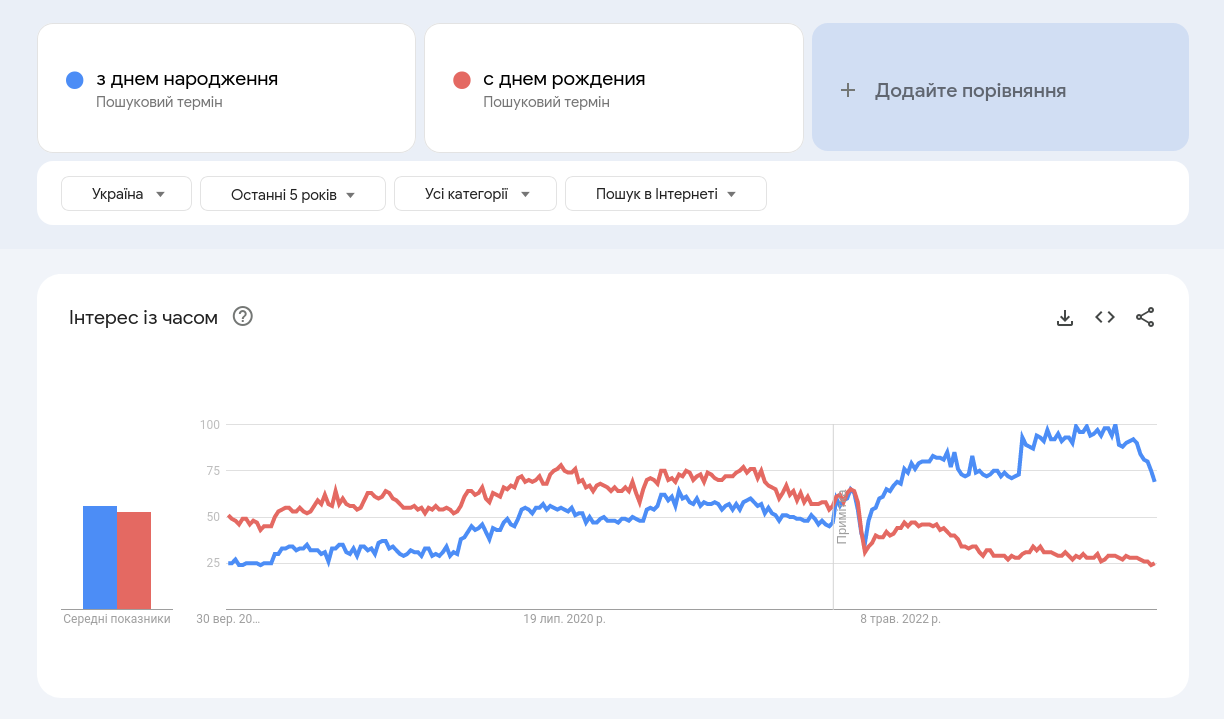 Для початку ми вирішили подивитись як за останні роки набирають популярності 2 основні запити-конкуренти “з днем народження” та “с днем рождения”. Власноруч ви можете переглянути це в сервісі від Гугл - Гугл трендс.