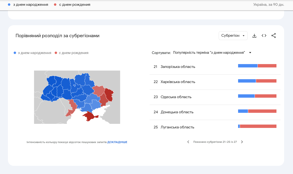 Якщо переглянути ці запити в розрізі “за останні 90 днів” по кожному регіону окремо, то можна побачити, що загальну статистику можна було б ще покращити, вигнавши деяких “не українців” з захоплених територій. Але навіть при цьому всьому Донецька область вітає українською в 26% випадків, тобто кожен 4 житель.