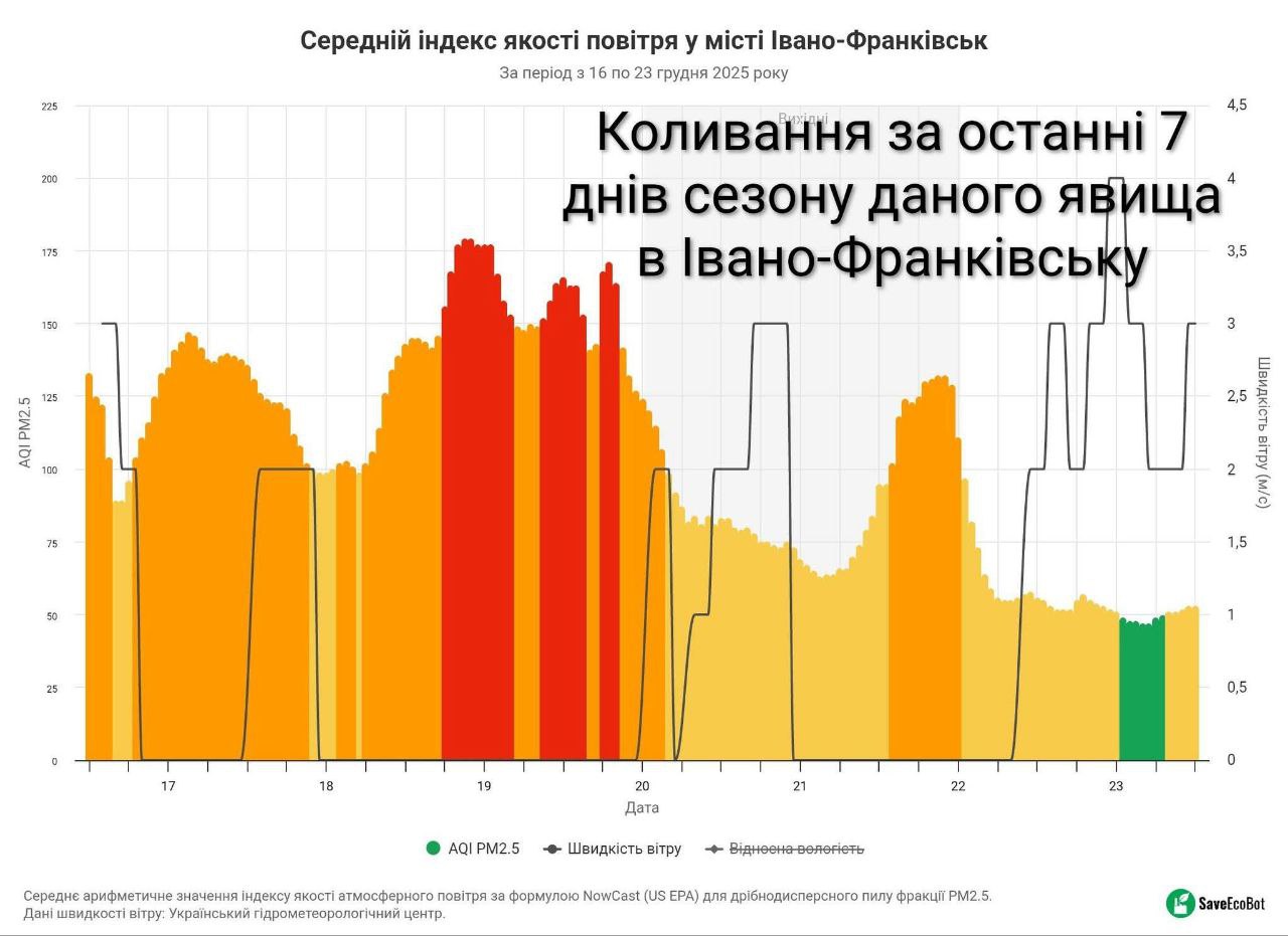 Згідно з їхніми даними, показник якості повітря AQI стрімко збільшився до 179, що є найвищим в усій Україні того дня. Пізніше показник почав зменшився, 20 грудня - становив 100., 21 грудня-73., 23 грудня- 55 (детальніше на графіках). Цифри свідчать про одно-дводенне явище, яке періодично трапляється взимку та міжсезоння. Ситуація не пов’язана з такими постійними факторами забруднення повітря як завантаженість автомобілями, пробки на дорогах, будівництво чи діяльність заводів (наприклад - Цементношиферний) та теплоелектростанцій (Бурштинська ТЕС).