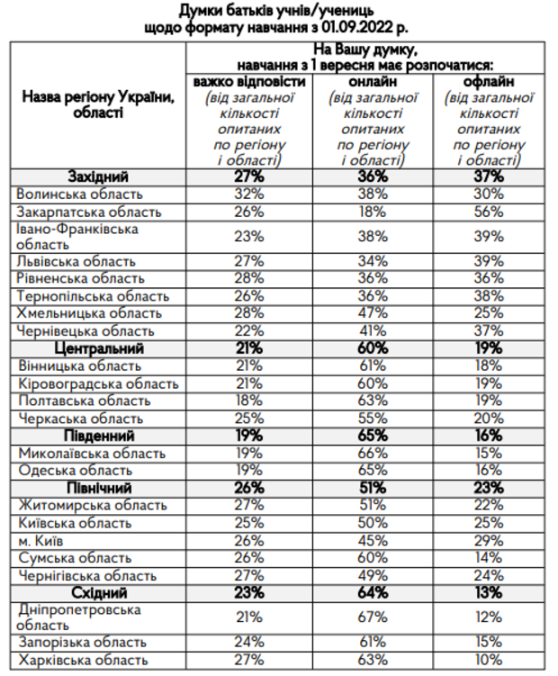 Так, в областях, в яких не відбуваються інтенсивні бойові дії, а лише звучать сигнали повітряної тривоги, батьки готові розпочинати навчання офлайн.