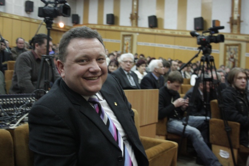 Першим доповідав директор інституту туризму Володимир Великочий. Молодий професор першим подав документи для участі у виборах. Із залу Великочию задали питання про його політичну приналежність. На що він відповів, що є позапартійним. «Університет мусить працювати з усіма політичними партіями, які працюють на розвиток країни» - вважає молодий науковець.