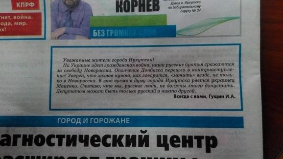 Черговий випуск муніципальної газети «Іркутськ» містить заяву місцевого депутата Івана Гущина.