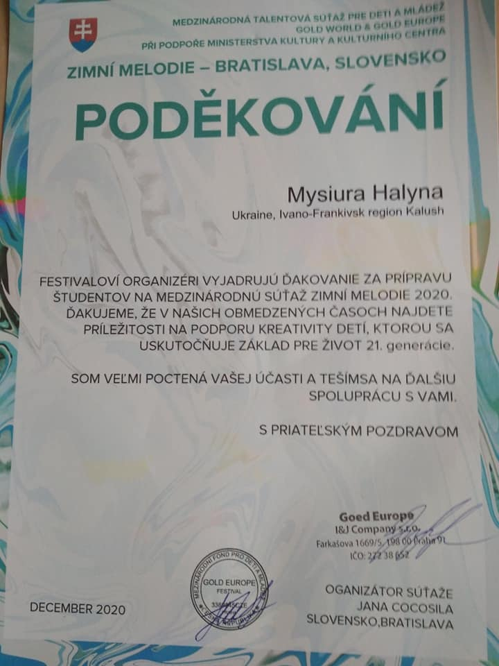Ансамбль скрипалів "Юні музиченьки" здобув ІІ місце в дистанційному міжнародному конкурсі "Зимова мелодія" у Братиславі, Словаччина.