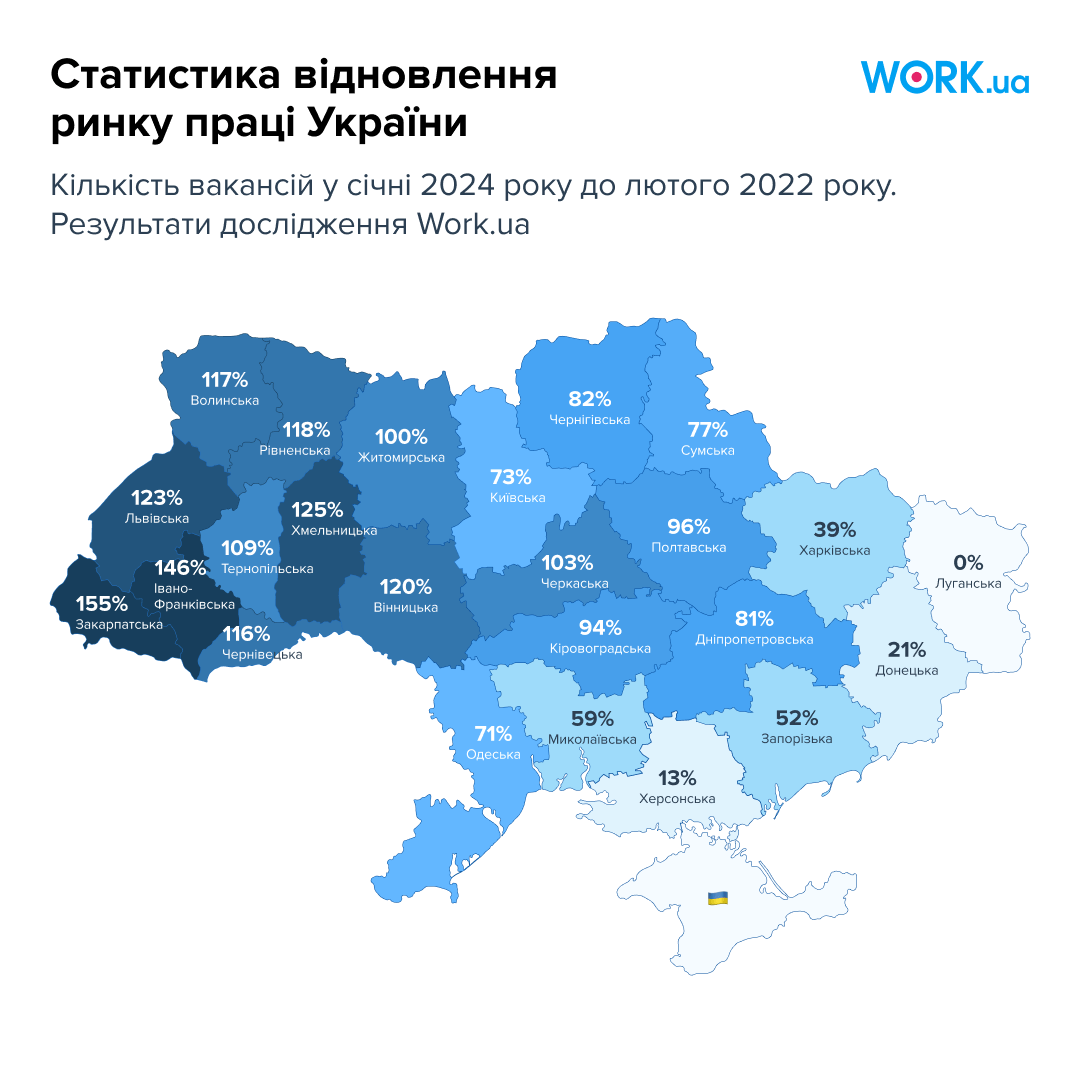 Якщо порівнювати з довоєнними показниками, найбільше зросла кількість вакансій у таких областях: Закарпатська (155%), Івано-Франківська (146%), Хмельницька (125%), Львівська (123%), Вінницька (120%), Рівненська (118%) та Чернівецька (116%).