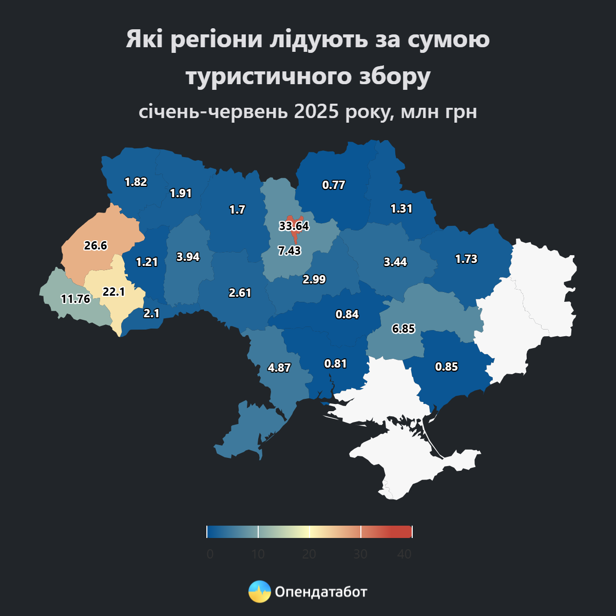 Головними «годувальниками» місцевих бюджетів цьогоріч стали Київ (33,6 млн грн), Львівщина (26,6 млн грн) та Івано-Франківщина (22,1 млн грн). Разом ці три регіони забезпечили 58% всіх надходжень від туристичного збору.