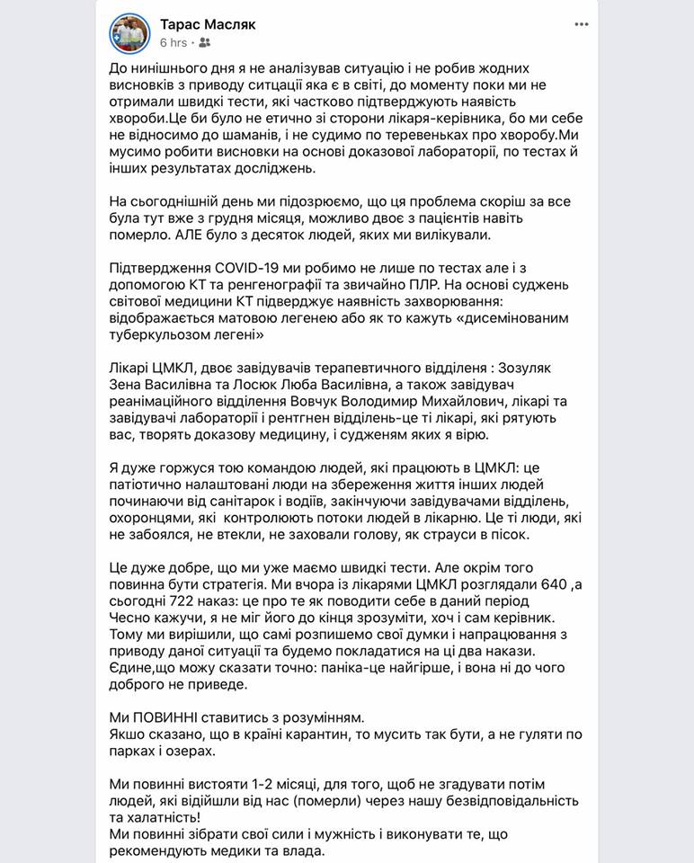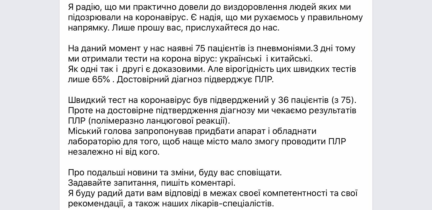 "Швидкий тест на коронавірус був підтверджений у 36 пацієнтів з 75. Проте на достовірне підтвердження діагнозу ми чекаємо результатів полімеразно ланцюгової реакції. Міський голова запропонував придбати апарат і обладнати лабораторію, щоб наше місто мало змогу проводити ПЛР незалежно ні від кого", - написав Тарас Масляк.