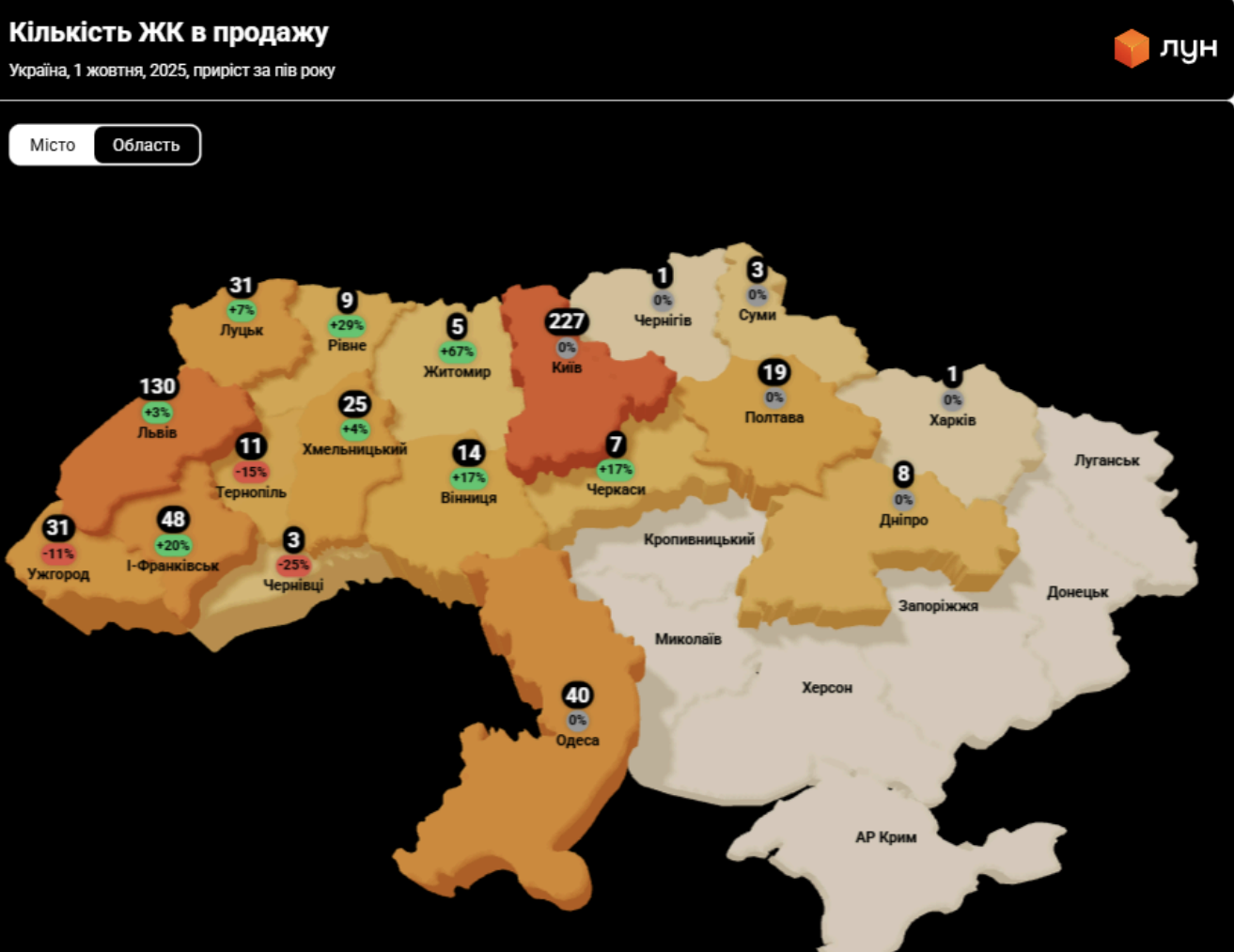 Найбільший вибір квартир сьогодні у Києві та Київській області — відповідно 177 і 227 житлових комплексів. Львів і область пропонують квартири у 145 і 130 ЖК, Тернопіль — у 67 ЖК. Навіть у містах, де тривають обстріли, будівництво і продажі продовжуються: у Дніпрі зараз працюють 52 житлових комплекси.