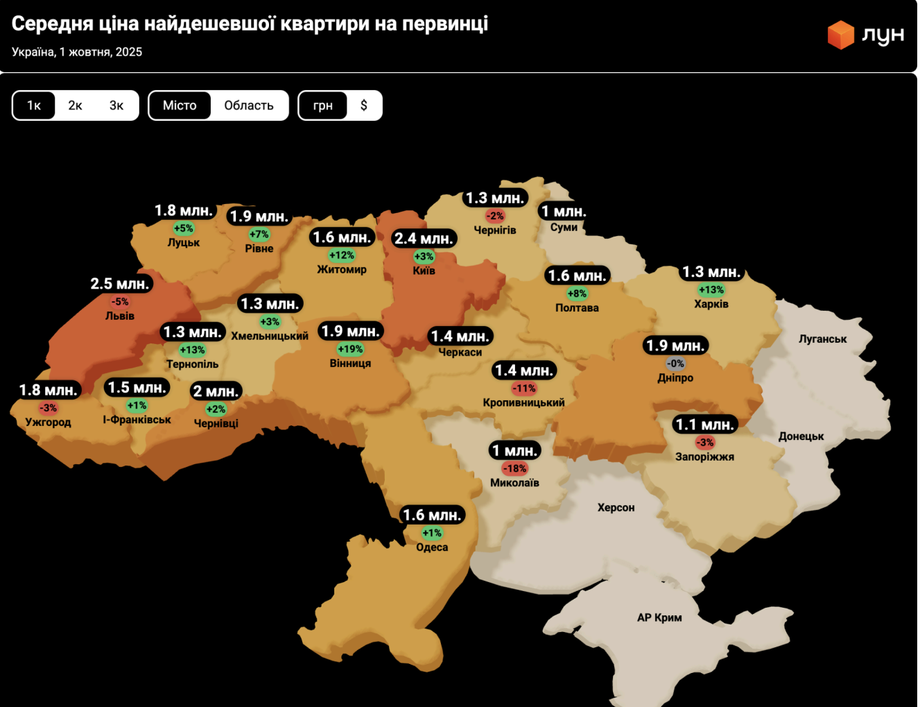 Найдорожчі квартири зараз у Львові — 57 900 гривень за квадратний метр, Києві — 54 200 гривень, та Ужгороді — 47 700 гривень за квадрат. Найдоступніше житло можна знайти у прифронтових містах: Запоріжжі — 24 100 гривень за квадрат, Сумах — 26 000 гривень, Харкові — 28 200 гривень та Миколаєві — 29 100 гривень за квадратний метр.