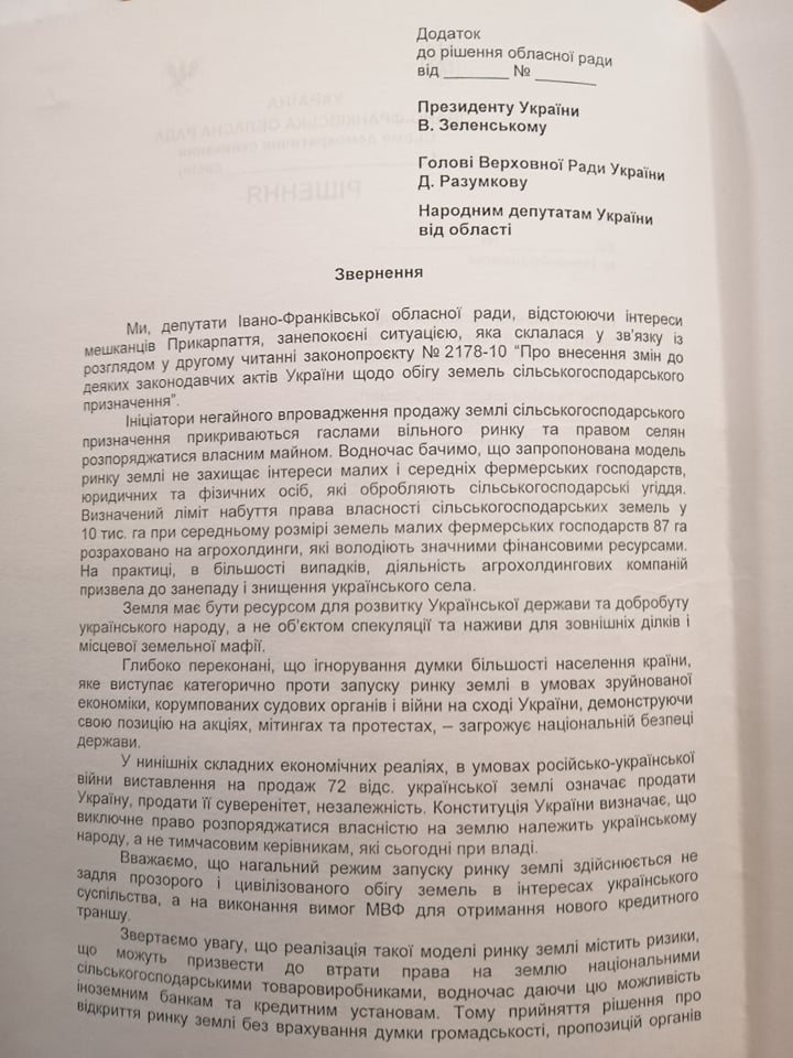 «Закликаємо Президента України В. Зеленського та Верховну Раду не допустити прийняття відповідного закону до відновлення територіальної цілісності України, завершення військових дій, стабілізації політичної ситуації, а народних депутатів від області утриматися від голосування за розпродаж національного багатства – української землі», - закликають у зверненні.