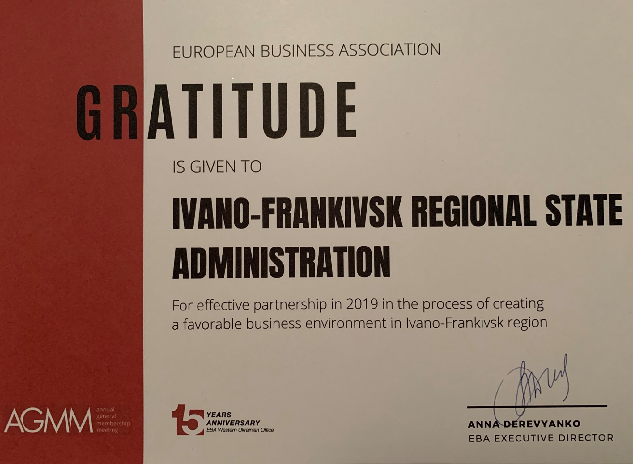 Європейська бізнес-асоціація відзначила Івано-Франківську облдержадміністрацію за ефективну співпрацю у створенні сприятливого бізнес-середовища в області.