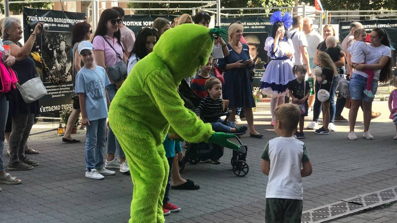 Перформанс розпочався перед будівлею театру, де герої з мультфільмів та ляльки розважали перехожих дітей, — танцювали, гралися з ними, розповіли про свої вистави, а також розіграли запрошення серед глядачів.