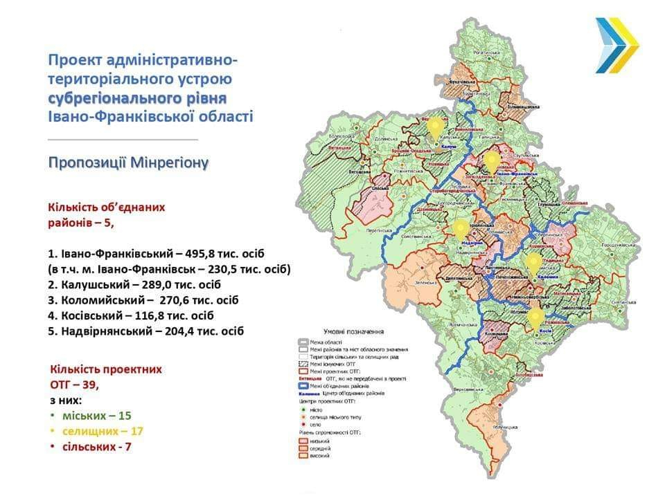 Загалом, в нашій області передбачено п'ять районів: Івано-Франківський, Калуський, Коломийський, Косівський та Надвірнянський.