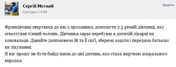 «Зараз в лікарні на Коновальця лежить 2,5 літня дівчинка, яку згвалтував п"яний сусід. Лікарі не хочуть її лікувати, бо бідна сім"я. Народ, не будьте байдужі, зберіть гроші і провідайте дівчинку. Ми з співробітницями трохи, але допомогли. Це ж ненормально...», - пише схвильована дівчина.