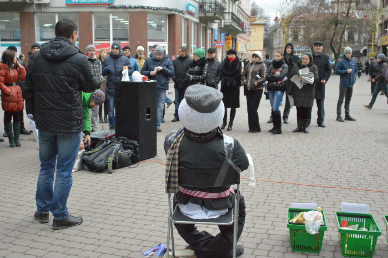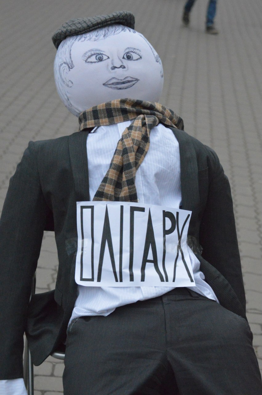 В центрі міста активісти однієї з партій влаштували театралізований флешмоб "Затягни пасок олігарху", в рамках якого кожен бажаючий міг затягнути пасок на пузі ляльки-олігарха.