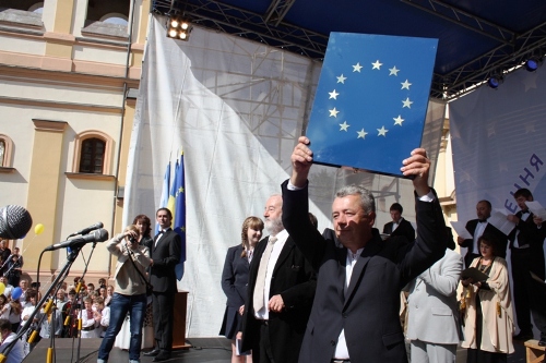 Одну із найвищих відзнак Євроспільноти обласному центру Прикарпаття вручав почесний член ПАРЄ, колишній депутат Парламенту Швейцарської Конфедерації Віктор Руффі.