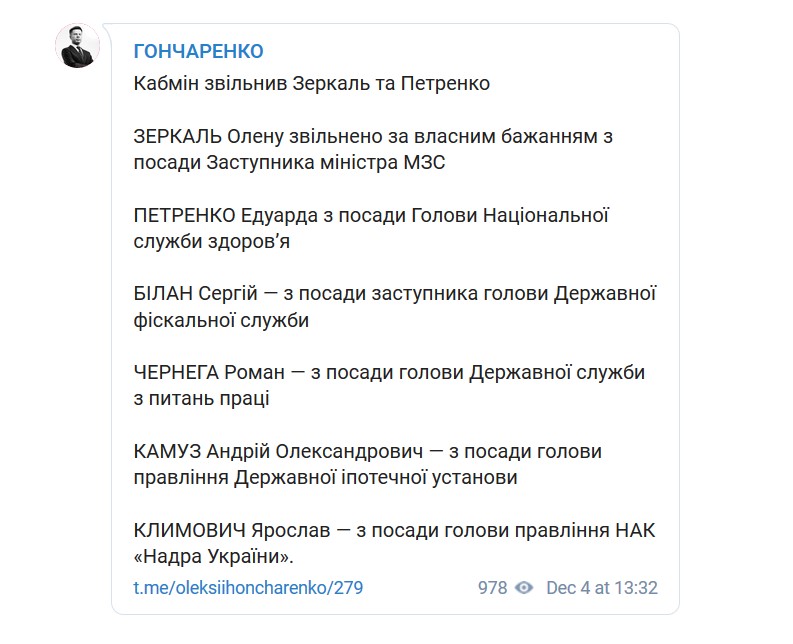 Як йдеться у дописі народного депутата Олексія Гончаренка  на засіданні 4 грудня уряд звільнив: