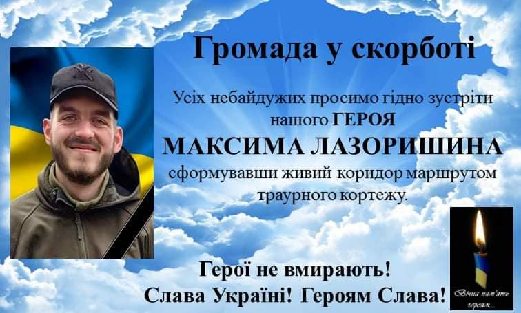Сьогодні, 22 січня, о 17:00 год траурний кортеж, що буде супроводжувати полеглого героя Максима Лазоришина, вирушить з Калуської ЦРЛ і рухатиметься вулицями міста.